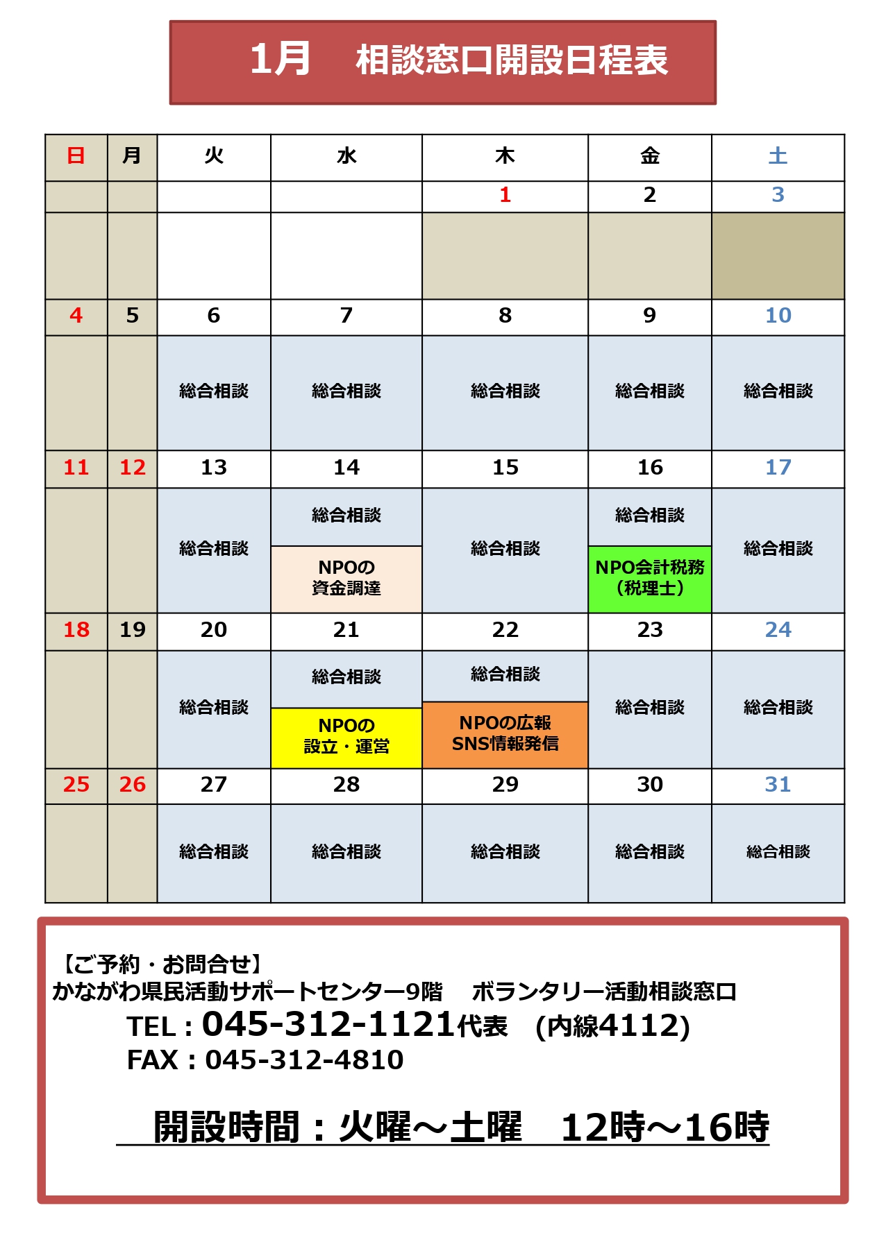 ボランタリー活動相談窓口 <専門相談>のご案内 各分野のエキスパートが対応いたします! かながわ県民活動サポートセンター9階 ボランタリー活動相談窓口では、NPO法人設立や運営、会計税務、資金調達など、NPOや市民活動団 […]