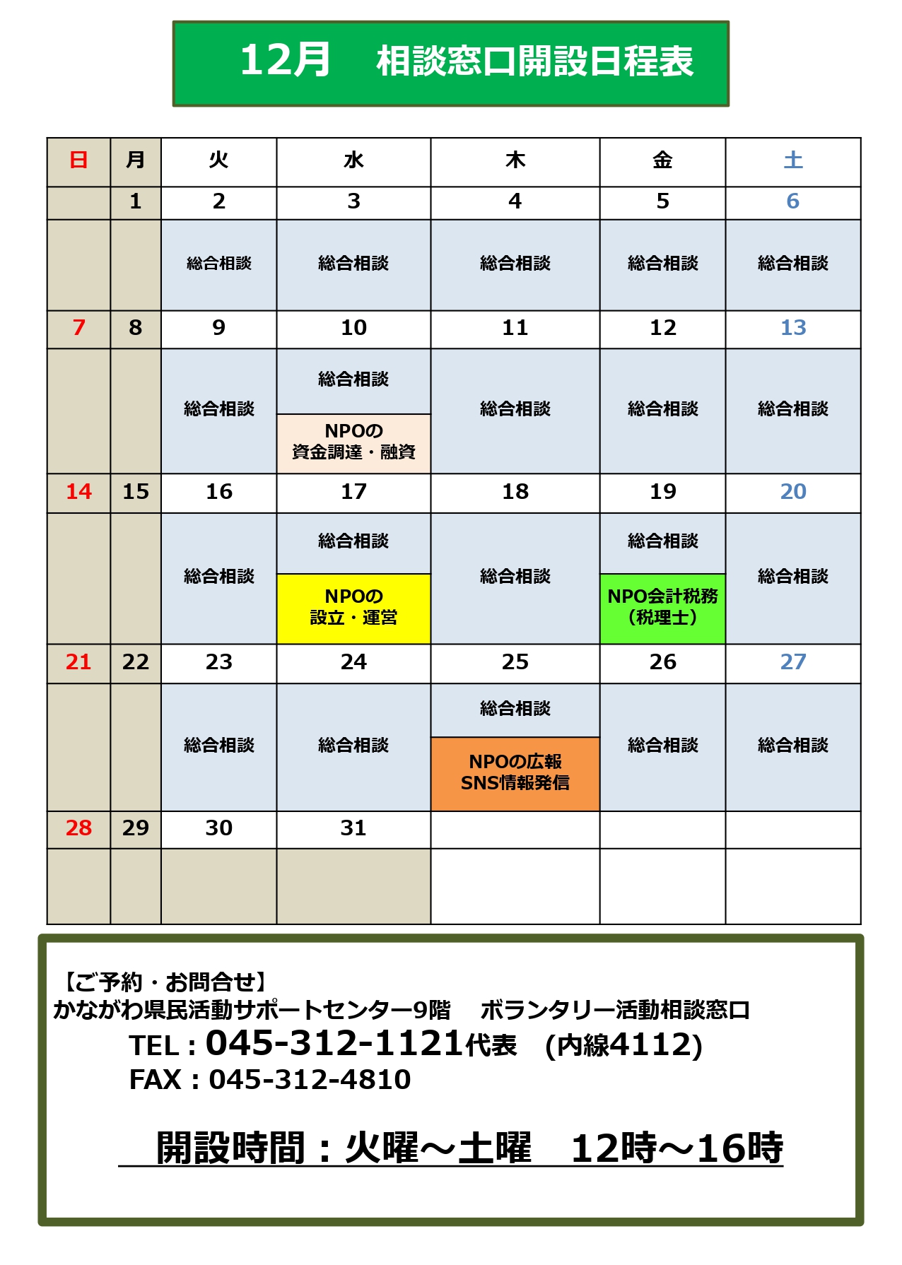 かながわ県民活動サポートセンター9階 ボランタリー活動相談窓口では、NPO(非営利団体)の活動に関する一般的なご相談のほか、テーマごとに相談日を設けております。対面、電話、メール(相談フォーム)のほか、Zoomによるオン […]