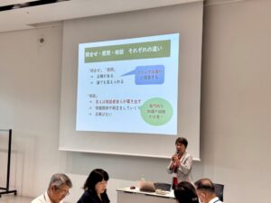 本研修は、横浜市各区の市民活動や生涯学習支援等に携わるスタッフに対する全3回の研修の2回目として「支援センターに必要なコミュニケーション『相談業務について』」と題し、当法人理事、藤井京子より講義を行いました。