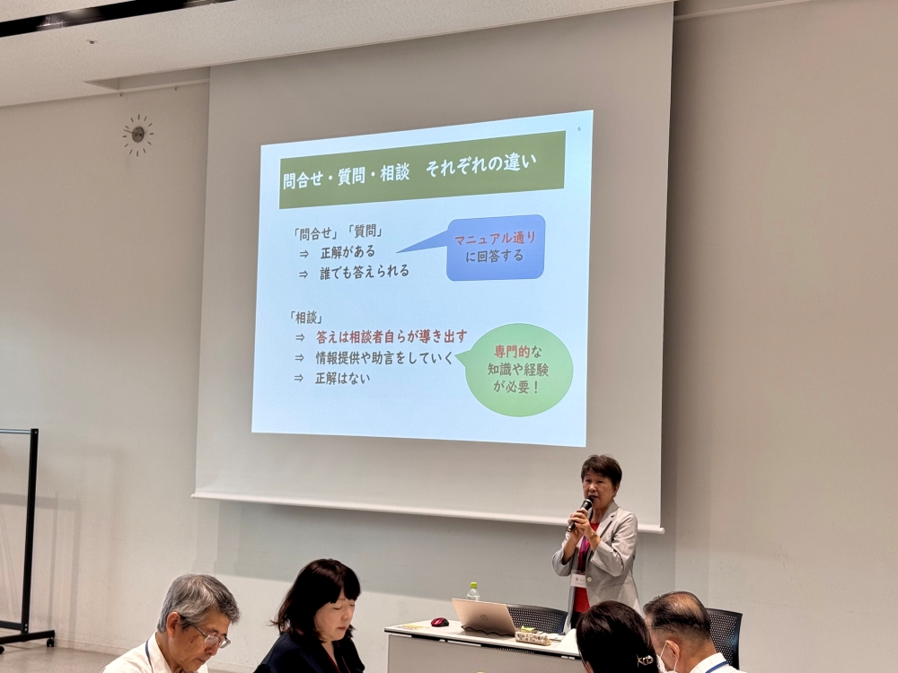 まず「問い合わせ・質問・相談」のそれぞれの違いを解説しました。答えがある「問い合わせ・質問」に対し、「相談」は相談者自らが答えを導き出すための情報提供や助言をすることが大事であることや、相談に対する姿勢や相談記録の作成方法や職場内での共有方法のノウハウを説明しました。最後に講師から「相談は答えを出すだけではなく、相談者本人の思いを整理し後押しすることが大事」というメッセージを参加者にお伝えしました。