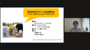 講義では、ファンドレイジング(資金調達)とファンレイジング(ファンの獲得)に向けた基礎的な講義をはじめ、鎌倉氏が携わったプロジェクトや、各地の事例を踏まえた解説を行いました。また、個人ワーク(自身の活動が未来社会への投資につながっているか)をした後、3~4人のグループに分かれて個人ワーク内容を発表及びルーム内で意見交換・交流をしていただきました。
